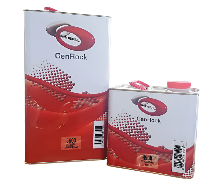 Two cans of General Genrock 5600 Accelero 2K Clearcoat, one larger and one smaller, with red and white labels.