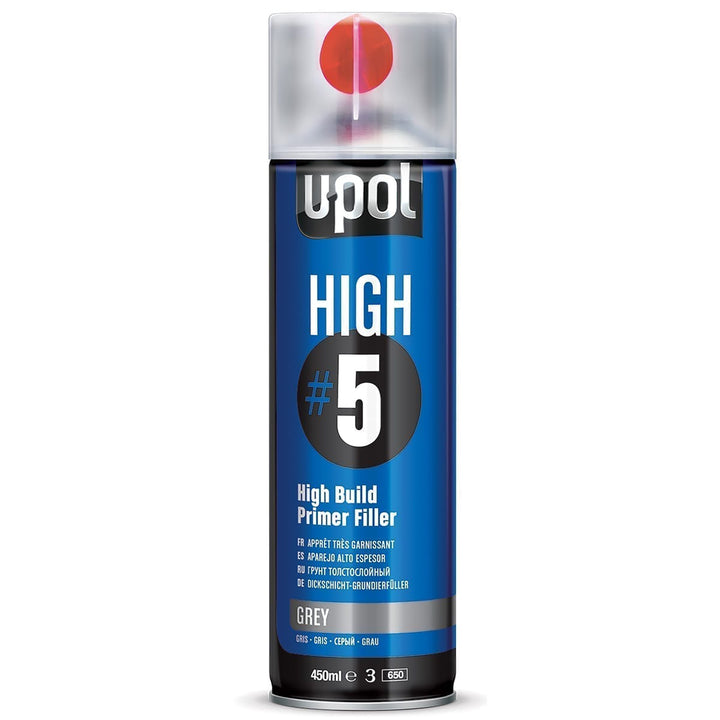 El primer relleno U-POL High #5 es un primer relleno de alto espesor listo para usar 1K en un aerosol. Se utiliza para imprimar superficies irregulares antes del recubrimiento final. High #5 es capaz de producir una capa de un espesor de película similar al de una imprimación aplicada con pistola rociadora. La conveniencia de usar una imprimación aparejo de alto espesor en un aerosol significa que el enmascaramiento se mantiene al mínimo. Se evita mezclar pintura y limpiar equipos de rociado como resultado del uso de imprimador de relleno High #5, lo que genera ahorros en tiempo y materiales. La imprimación de relleno High #5 no contiene cromatos y es fácil de lijar.