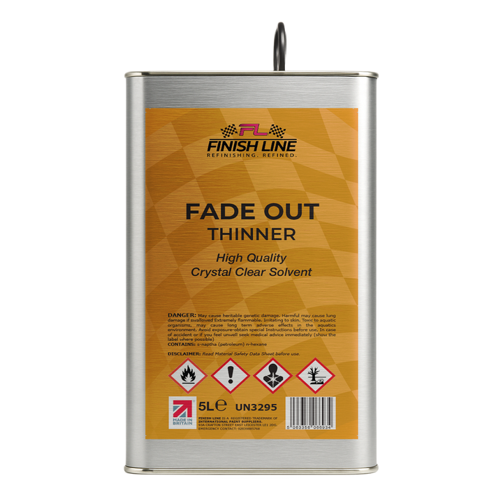 Our Finish Line Fade Out Thinner 5L is a high-performance blending solution designed to fade the edges of fresh clearcoat or 2K solid colours into existing paintwork. Ideal for SMART repairs, spot blends, and panel transitions, it enables a flawless finish by softening overspray and reducing visible blend lines. This fast-drying formula minimises film build-up and promotes a smooth, undetectable transition between new and old finishes—perfect for professional body shops or detailers aiming for a showroom-quality result.