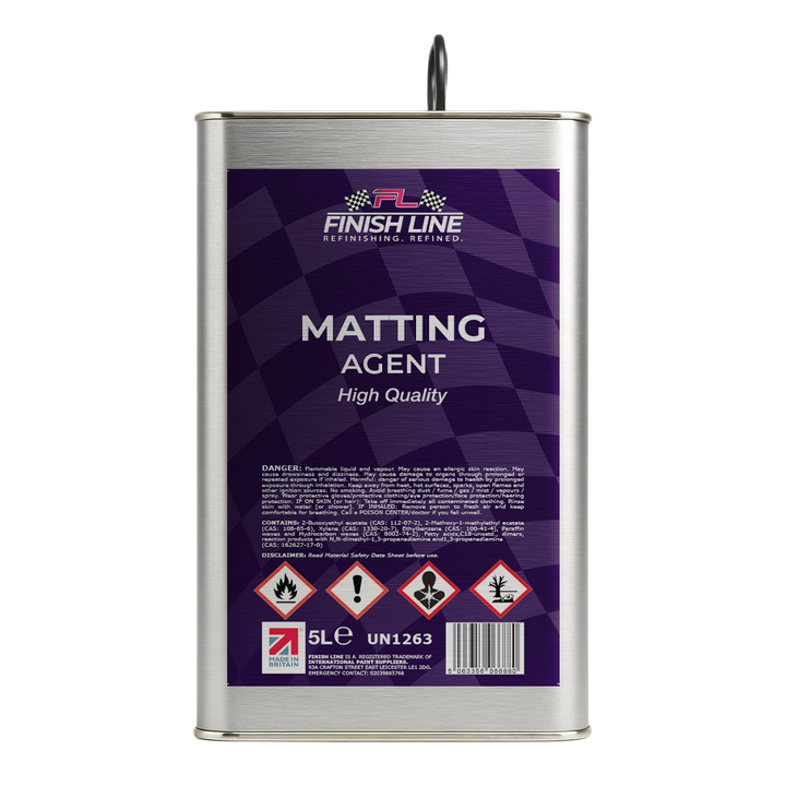 Our Finish Line Matting Agent 5L is an additive utilized in paints and coatings to lower gloss and create matte, satin, or semi-gloss finishes. It functions by scattering light on the surface, thereby preventing the typical shine associated with glossy finishes. They create microscopic texture on the surface of the coating, diffusing light.