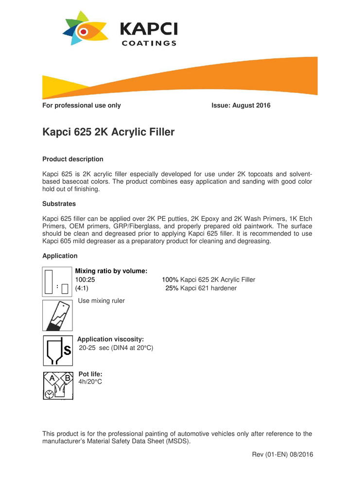 Kapci 625 is a flattable 2K acrylic filler developed for use under 2K acrylic paints, Kapci 660 or Kapci 670 basecoats. It's easy to apply and flat giving a good final appearance.
