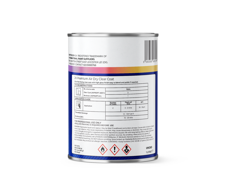 Elevate your automotive finishing with Protouch 2K Premium Air Dry Clearcoat Kit, a professional-grade solution comprising a 1-litre clear coat and 500ml hardener. This premium system delivers exceptional results with its ultra-fast drying performance, achieving full cure in just 30 minutes at 20°C. The clear coat offers superior flow-out characteristics and maintains outstanding gloss retention, proven to retain 90% of its shine after 2,000 hours of testing. Perfect for professional applications, this kit provides a water-clear finish that's easy to blend and polish if needed. The mixing ratio is precisely calibrated at 2:1 (clear coat to hardener) for optimal results. With theoretical coverage of 10-12m² per litre, this British-made coating system ensures a high-quality, durable finish for your automotive projects. For professional use only, with adequate training required before application.