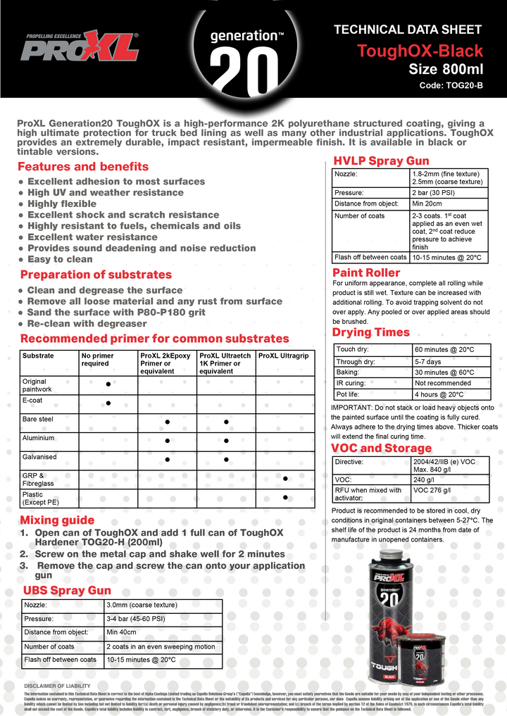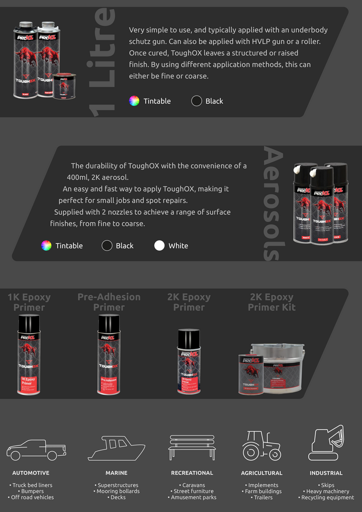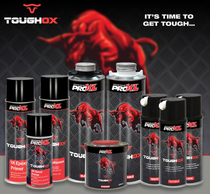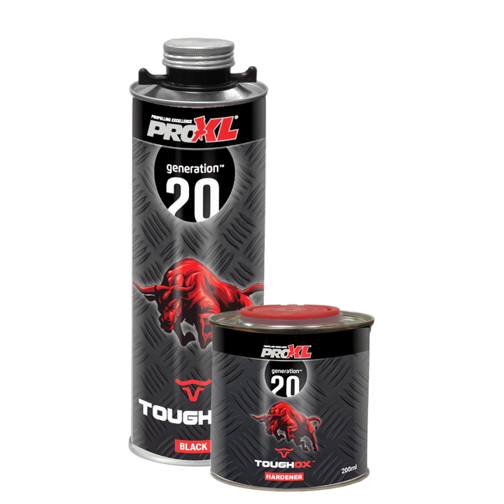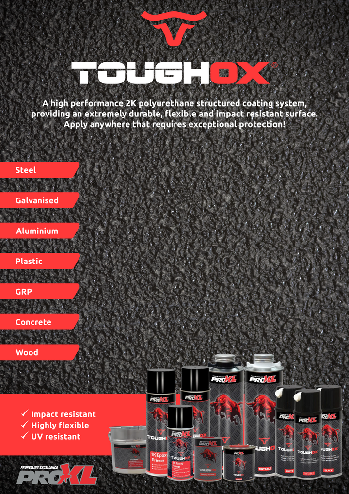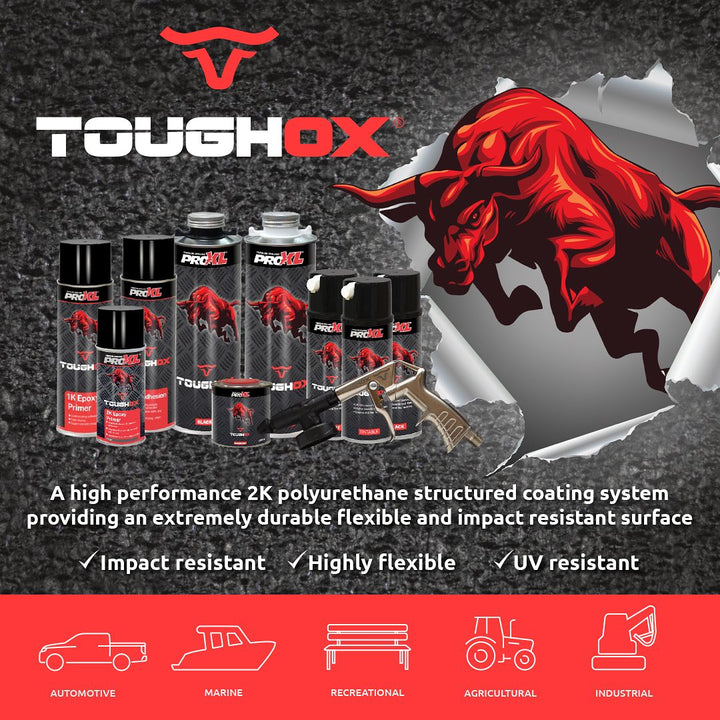 A high performance 2K polyurethane structured coating, giving ultimate protection for truck bed linings and many other industrial applications. ToughOX provides an extremely durable, impact resistant, impermeable finish. Kit contains – 1 x 800ml Black 2k Polyurethane, 1 x 200ml Hardener.