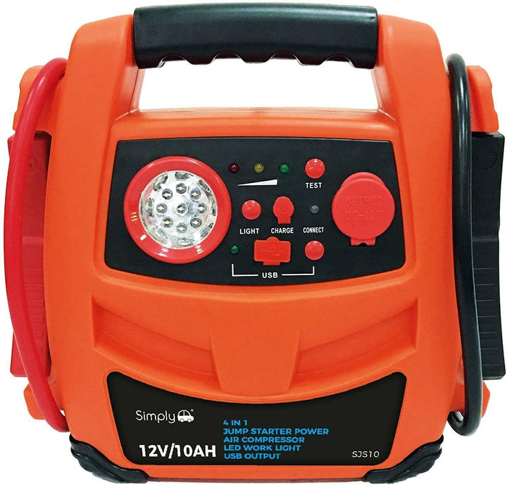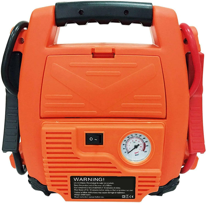 A portable jump starter with a 12V battery that is ideal for any jump starting needs and can be used on boats, cars, trucks, tractors, generators and is fully compatible with any 12-volt starting system. It also has a built-in air compressor and a 9 LED work-light. The jump starter utilizes a MAINTENANCE FREE SEALED BATTERY which allows the unit to be stored without fear of leakage. The jump starter can be conveniently stored under or behind a seat. Included are 2x air valves, 1x sports needle, 1x 12V car cigarette plug and 1x AC/DC charging adapter.